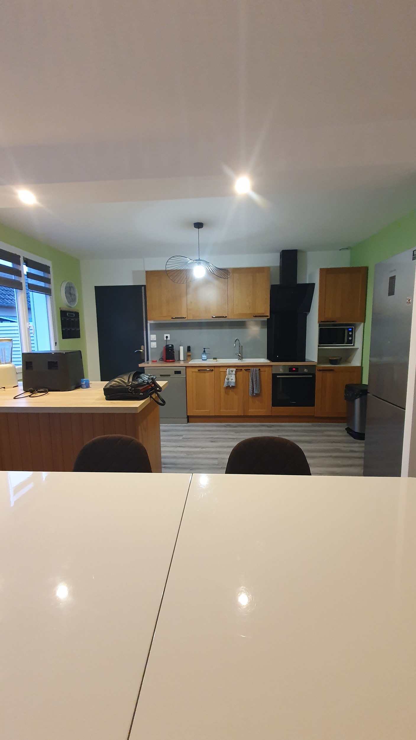 La pièce de vie se prolonge sur une cuisine ouverte, entièrement équipée et aménagée.