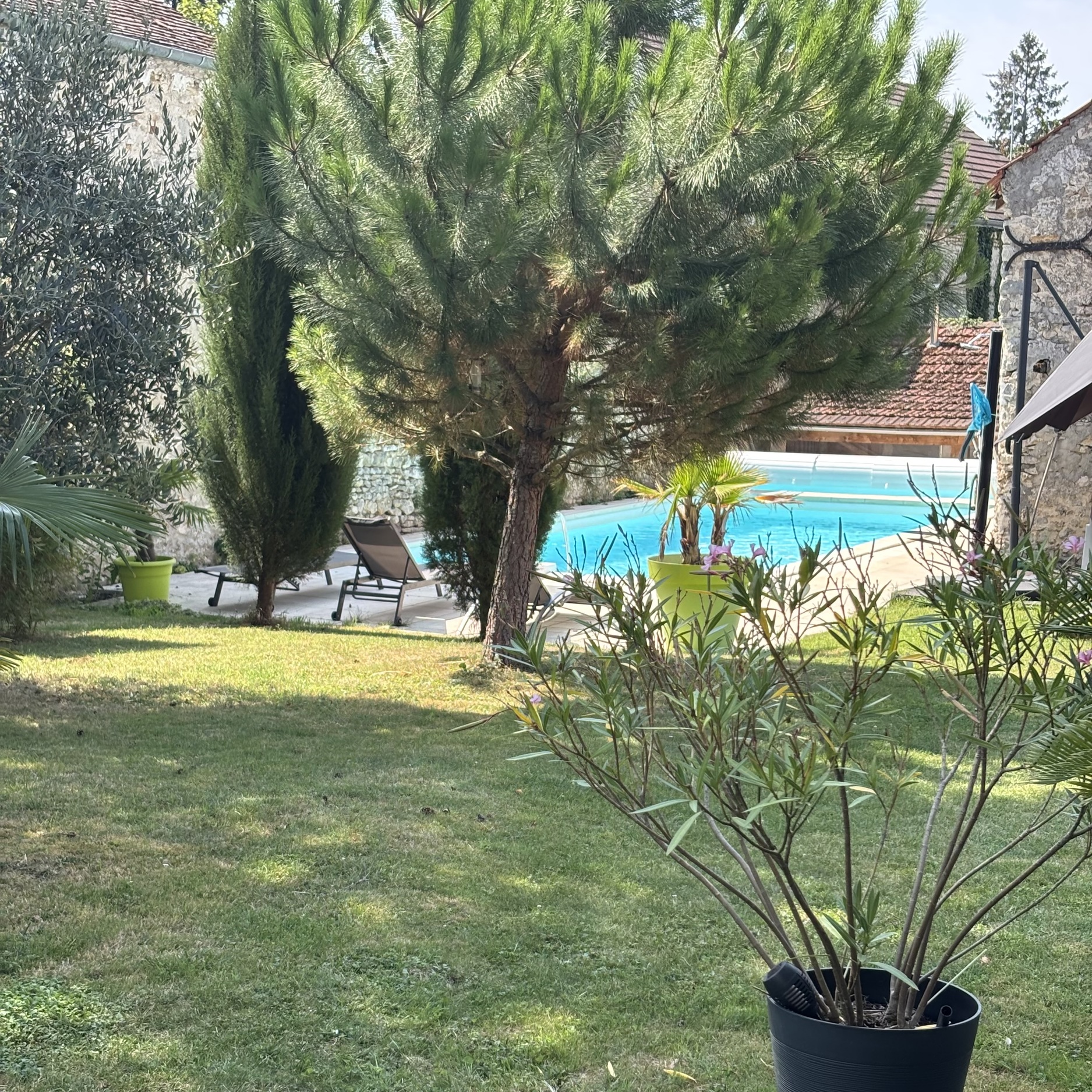À l'extérieur, le terrain entièrement clos de murs accueille une piscine chauffée, deux terrasses dont une couverte pour profiter du jardin en toutes saisons, ainsi qu'une dépendance dédiée au rangement du matériel de jardinage.